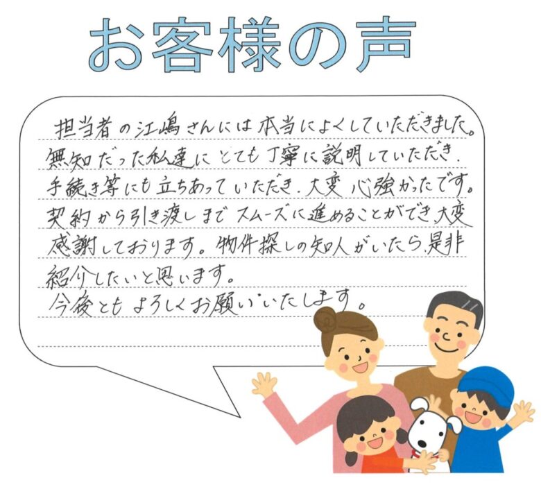 契約から引き渡しまでスムーズに進めることができ、大変感謝しております。物件探しの知人がいたら、是非紹介したいと思います。