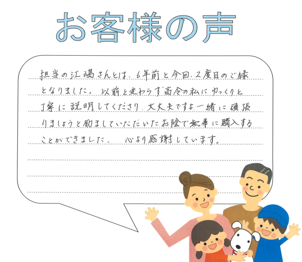 以前と変わらず、高齢の私にゆっくりと丁寧に説明してくださり、「大丈夫ですよ一緒に頑張りましょう」と励ましていただいたお陰で無事に購入することができました。